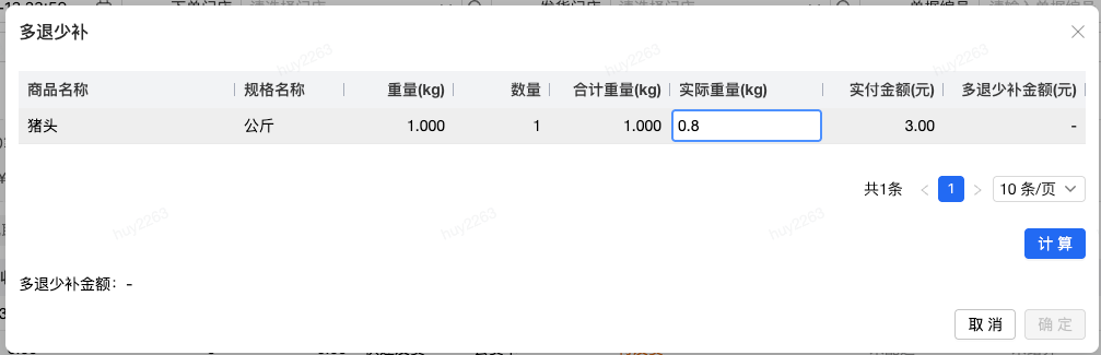 点击后展示多退少补弹窗,展示订单商品明细(已完成退款的不显示),支持输入每个商品的实际重量