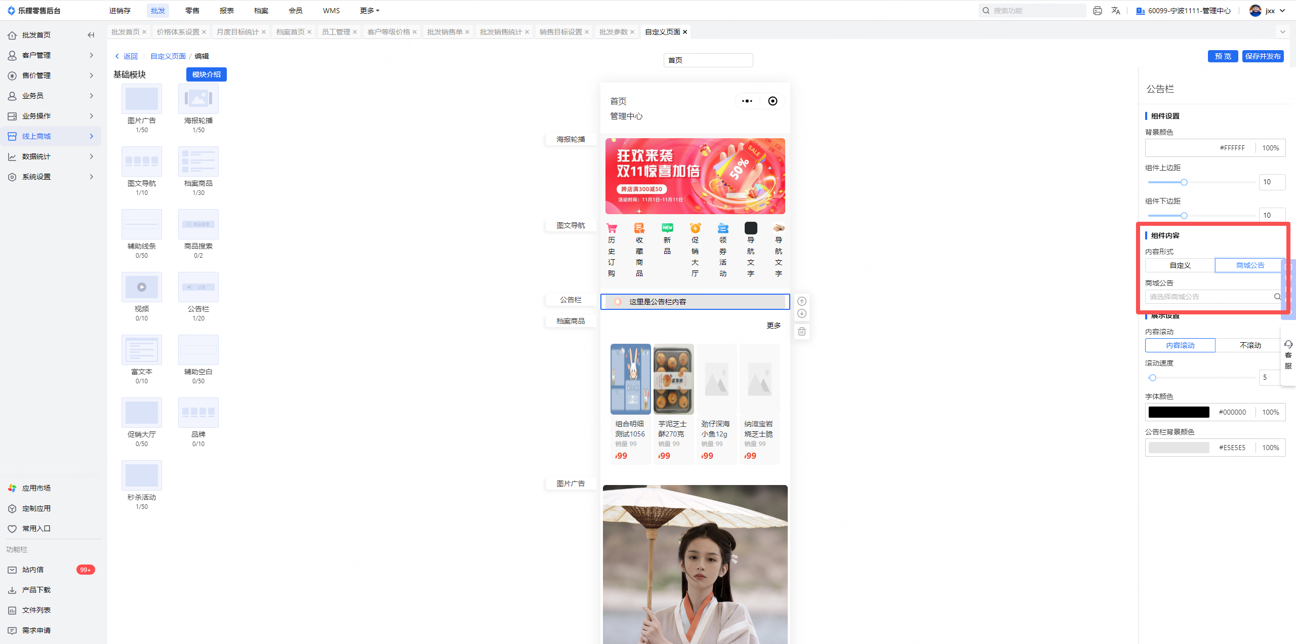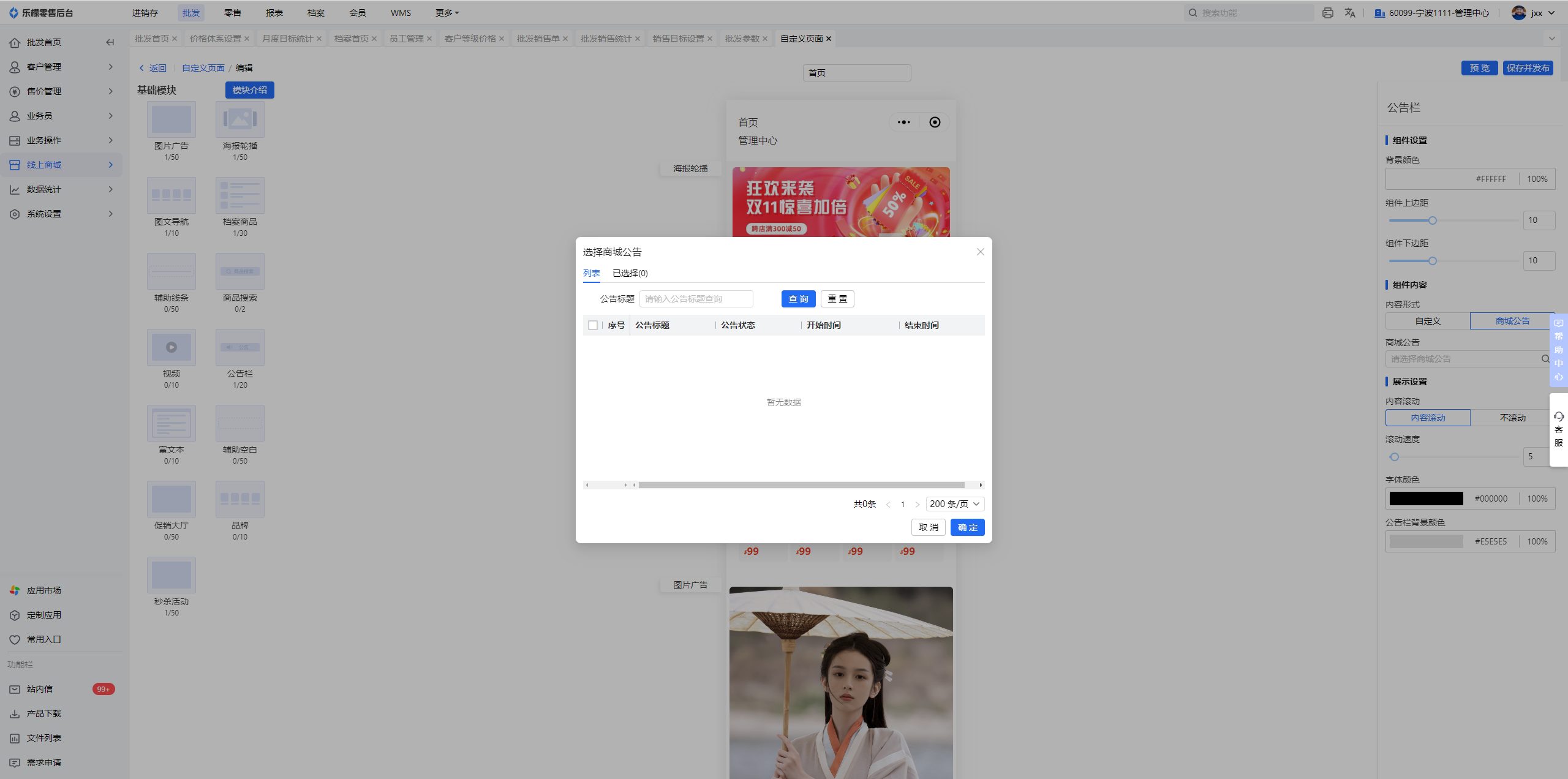 功能路径:WEB-批发-线上商城-自定义页面;小程序-首页-公告栏