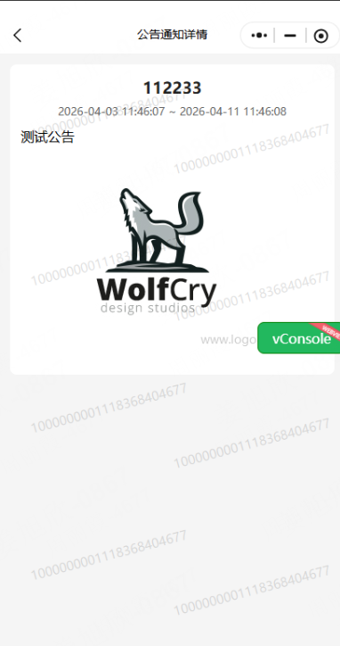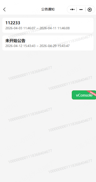 1、若公告栏选择了商城公告,那么小程序首页上展示的内容为“公告标题”,选择不滚动则展示第一个公告标题,选择滚动则按选择公告顺序滚动;点击可跳转至公告通知页面,展示支持查看详情;若时间超出公告结束日期,则该公告直接不展示在首页和公告列表中