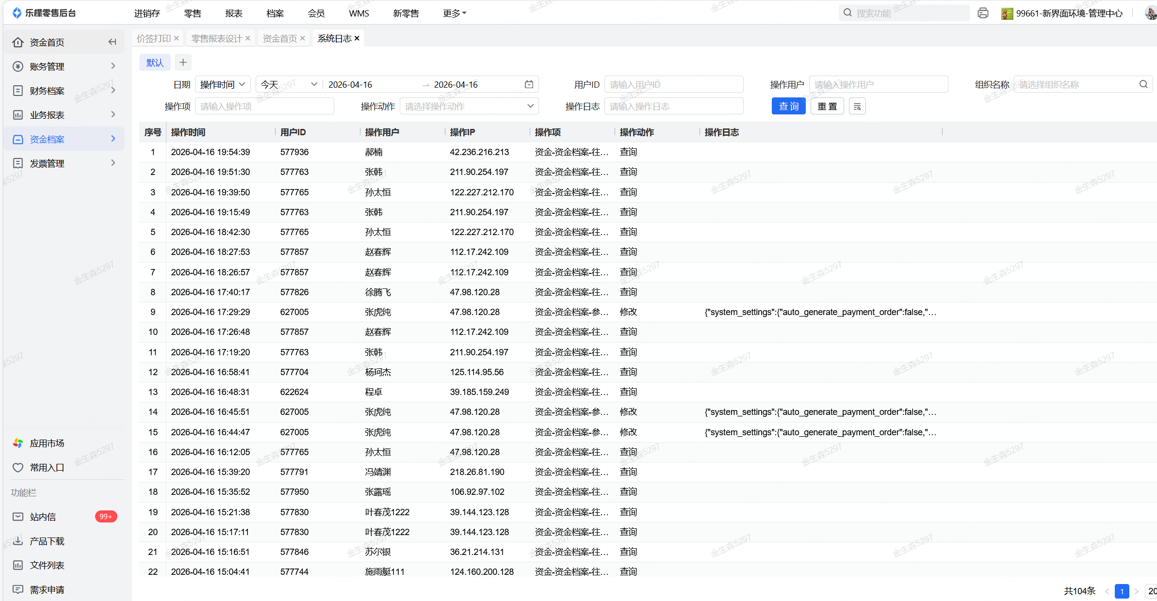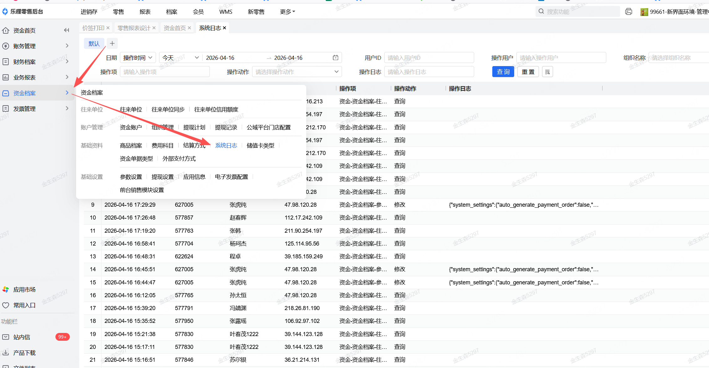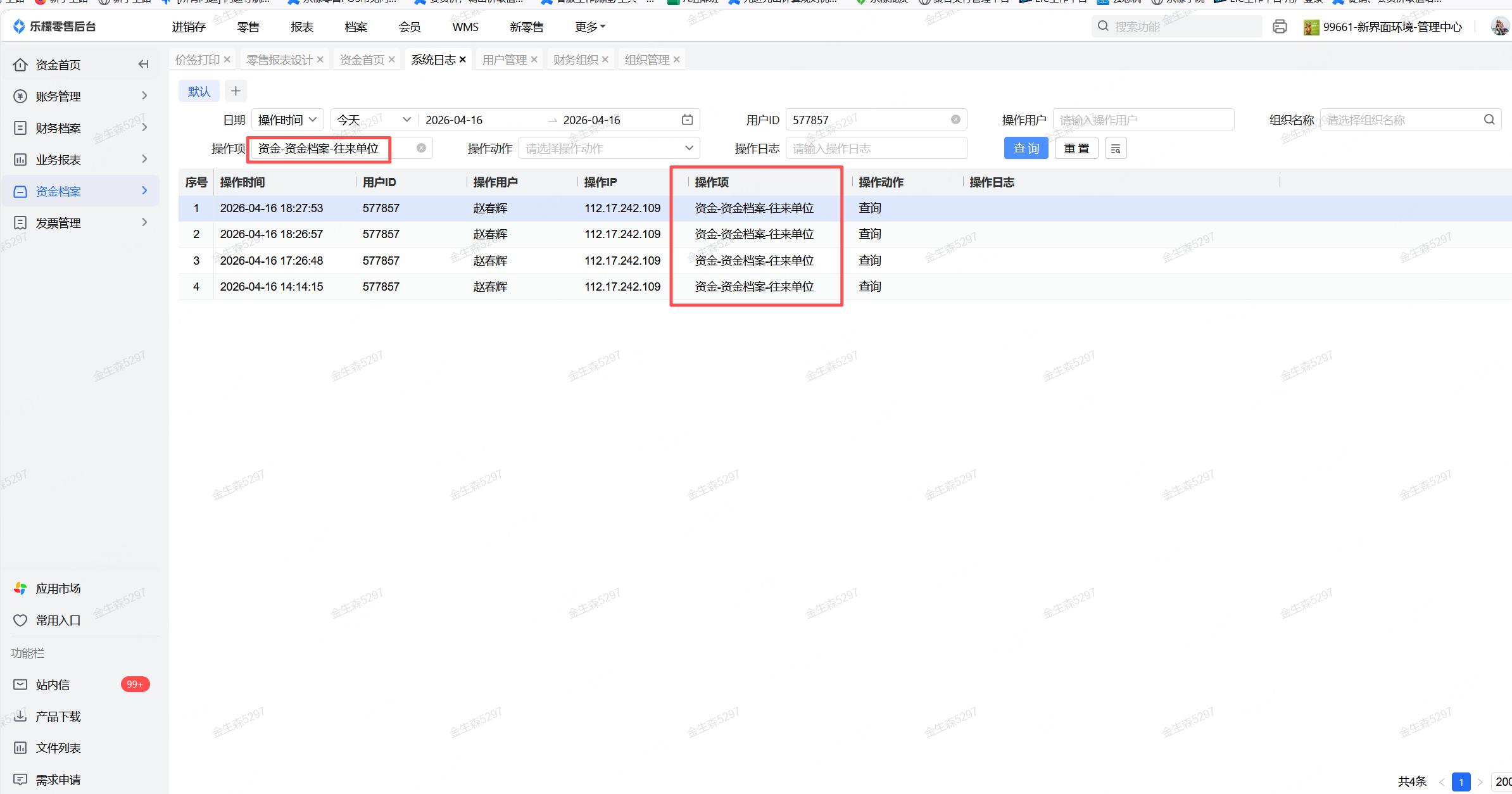 操作项 | 查询操作了哪个模块 如操作项:资金-资金档案-往来单位 查询出来的数据都是这个操作项的 |