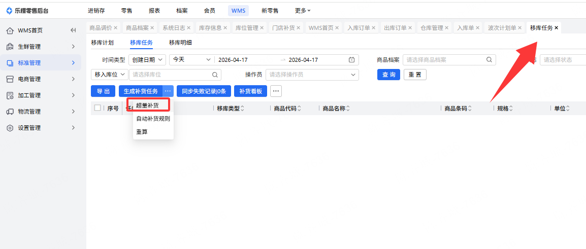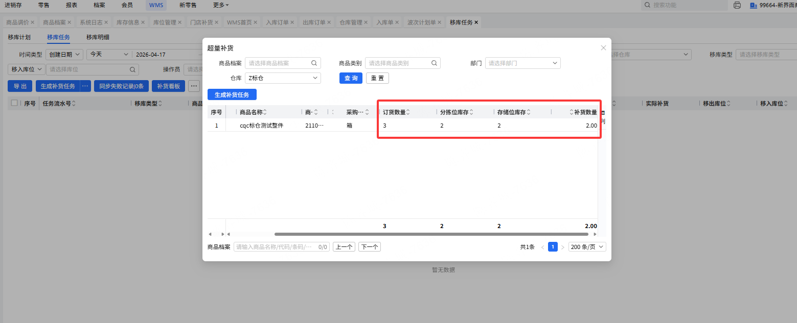 此时已发现分拣位库存不足,可到移库任务里超量补货去查询。查询自动会显示这个商品的记录,订货数量、分拣位库存、存储位库存,系统会自动分配补货数量,然后选中点击生成补货任务