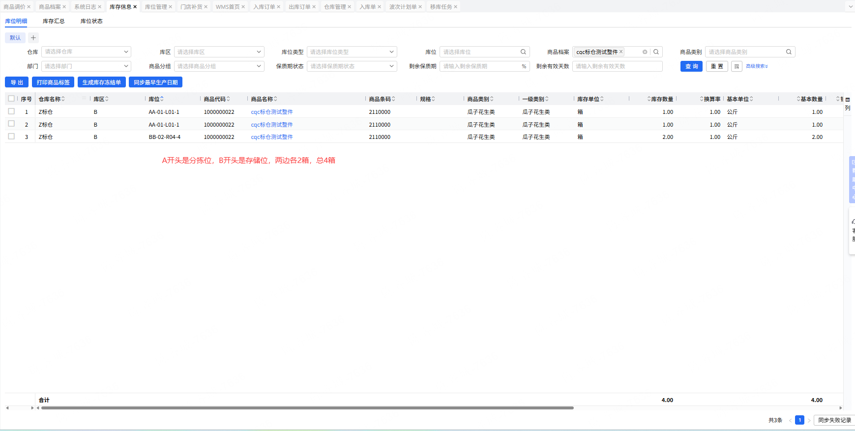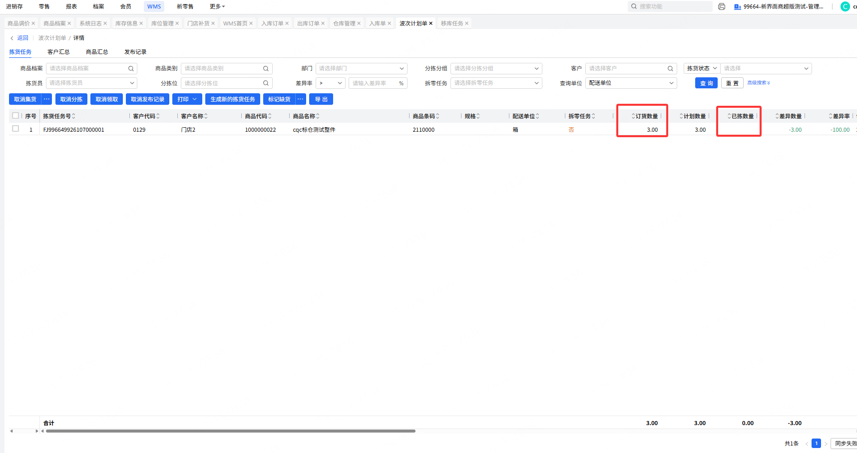 比如下图,wms标仓仓库总共库存是4箱,2箱分拣位两箱存储位上,门店要货单要货3箱,生成波次计划单分拣任务需要分拣3箱