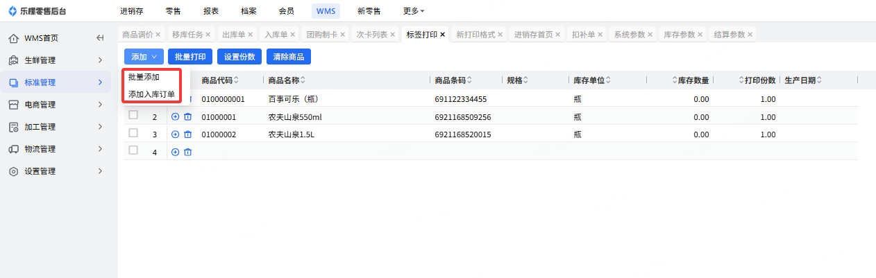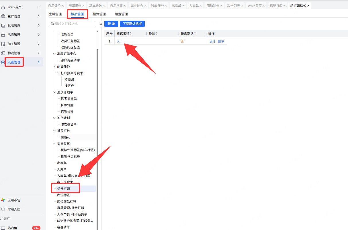 2.需要提前设置标签模板,模板在WMS-设置管理-新打印格式-标品管理-标签打印-新增