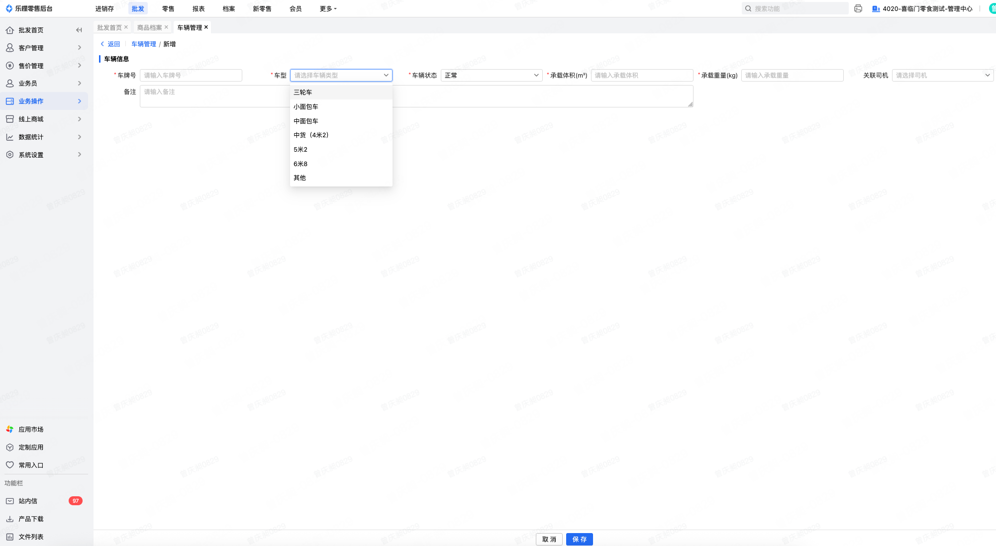 点击“新增”进入车辆信息新增页面,录入实际车辆的车牌号、车型、可装载体积和重量等相关信息,车辆可关联选择对应司机,司机取有批发业务员用户(有激活绑定业务员许可证的账号)