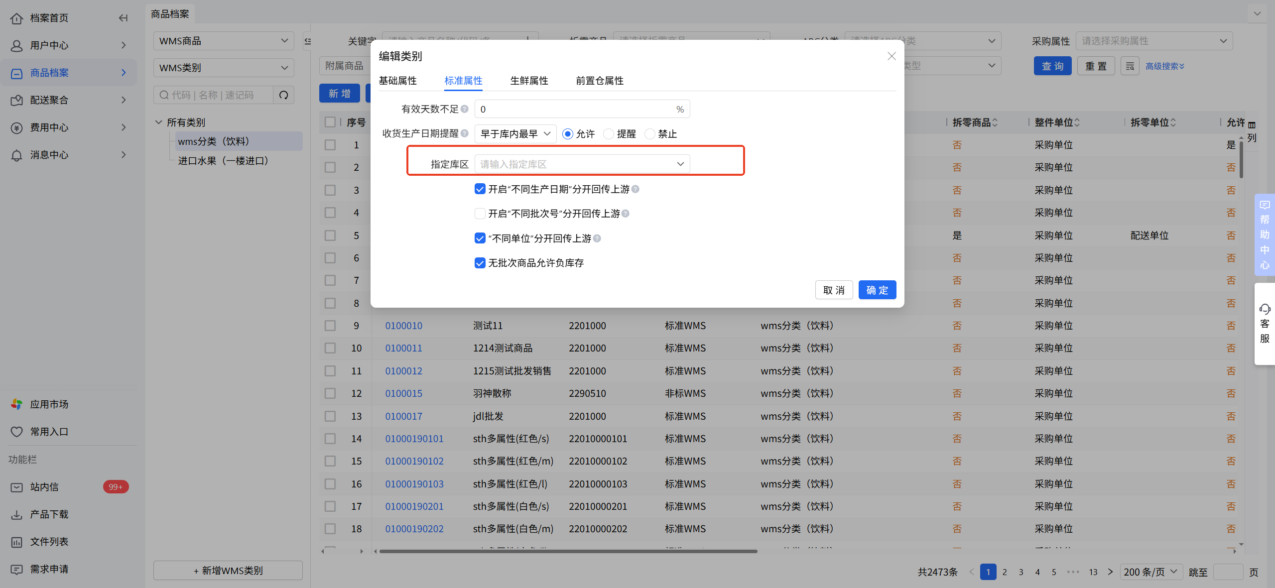 商品档案-WMS商品:按“WMS类别”指定库区
