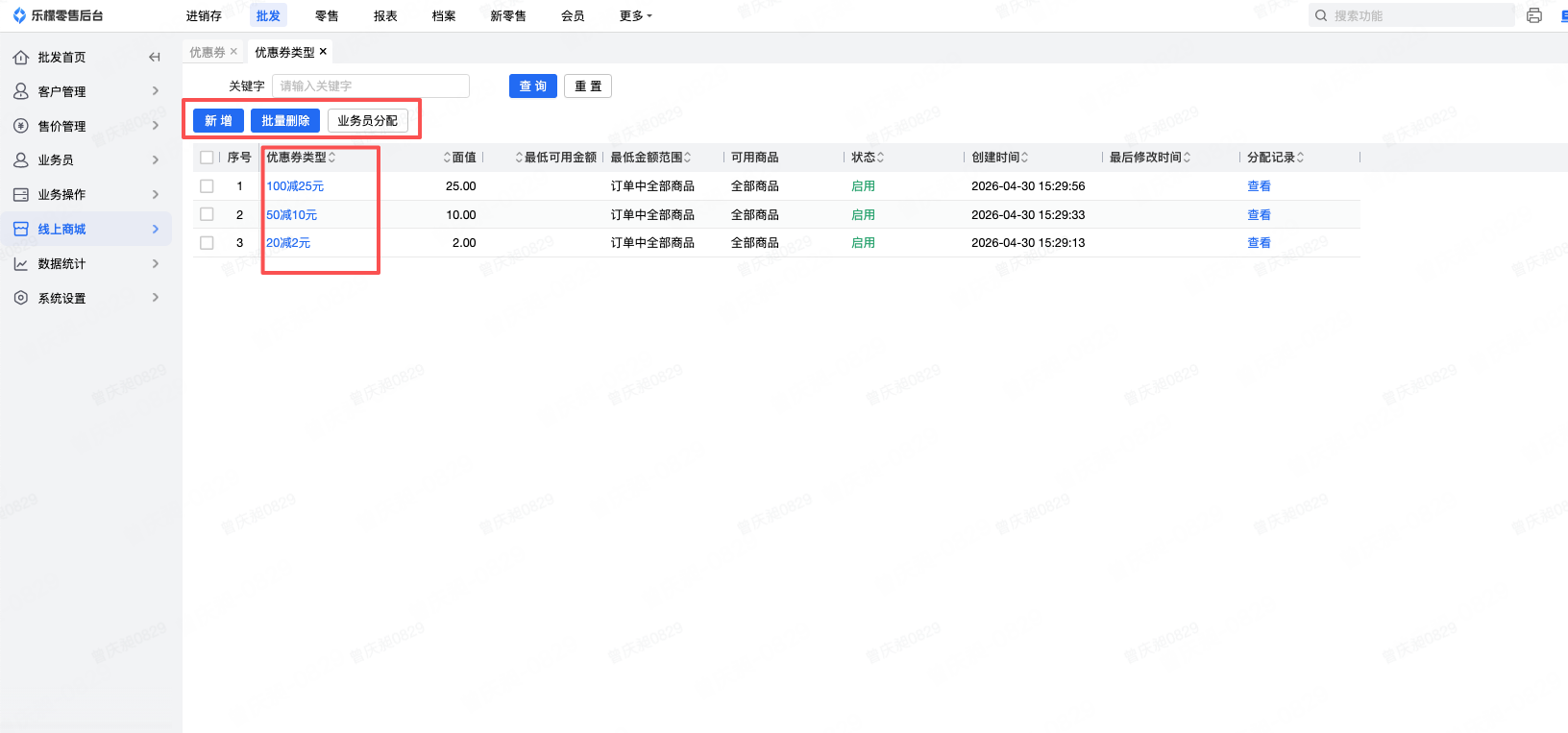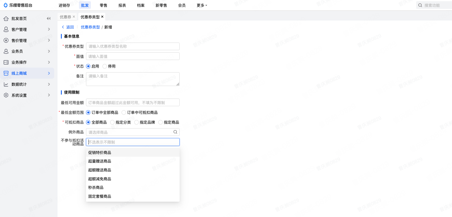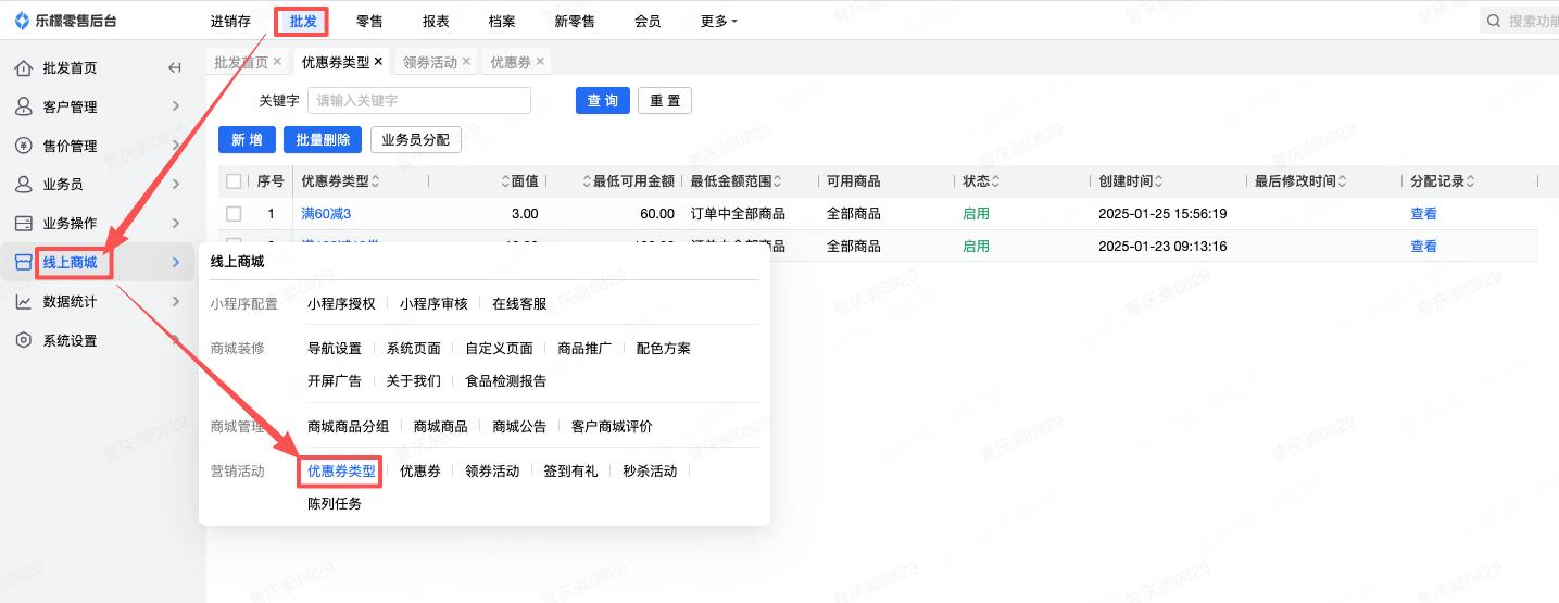 👉【功能路径】:批发-线上商城-优惠券类型
