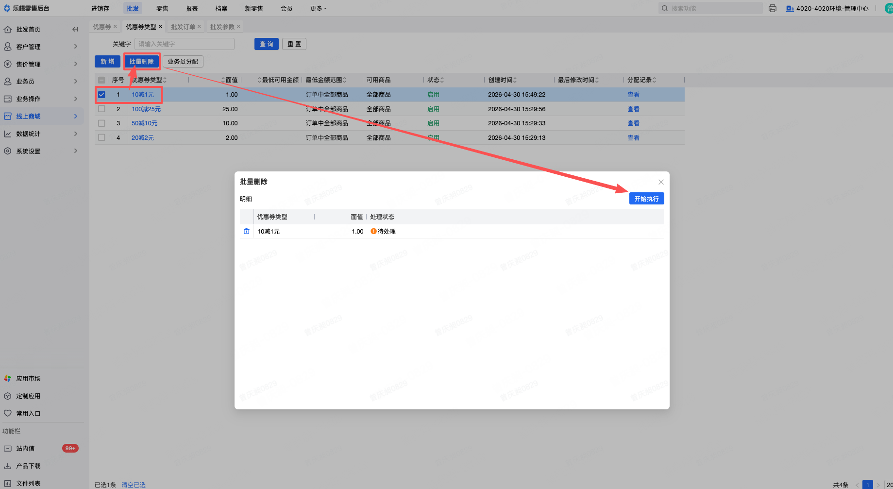 商家可能之前新增了很多优惠券类型,现在有些优惠券类型不用了,想要删除掉,可以通过批量删除进行操作