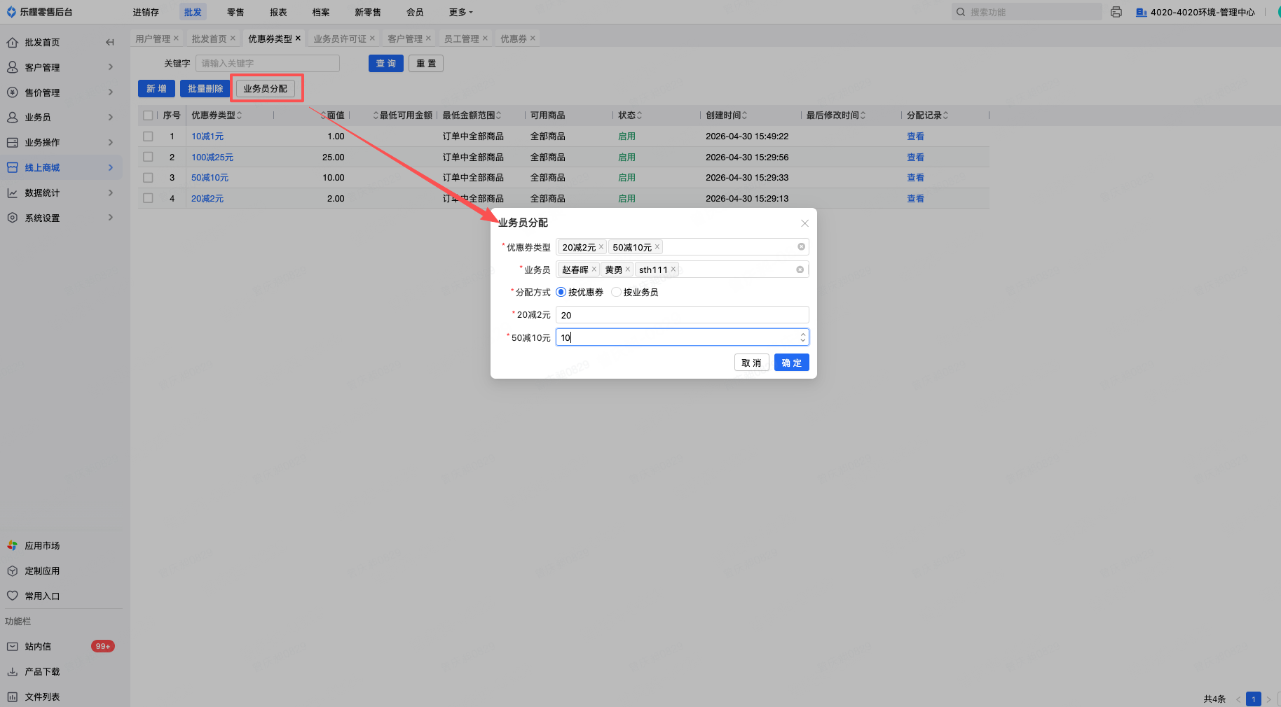 分配方式选择按业务员时,则下方出现所选业务员,可以按业务员分别设置不同业务员的优惠券发放额度。