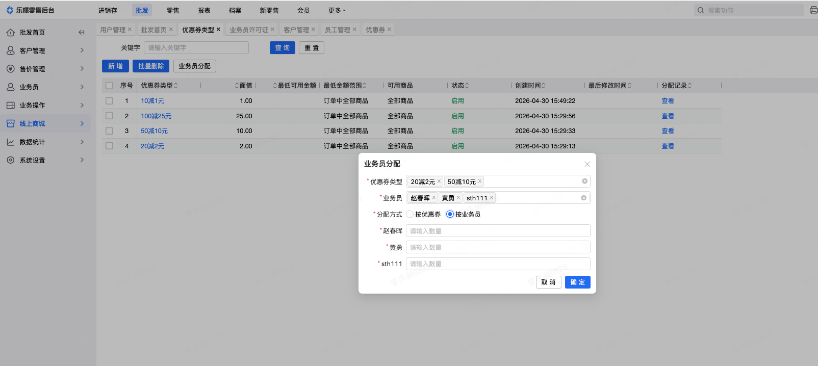 点击“业务员分配”弹出分配弹窗,选择需要分配的优惠券类型和业务员,优惠券类型和业务员支持多选,分配方式可以选择按优惠券和按业务员