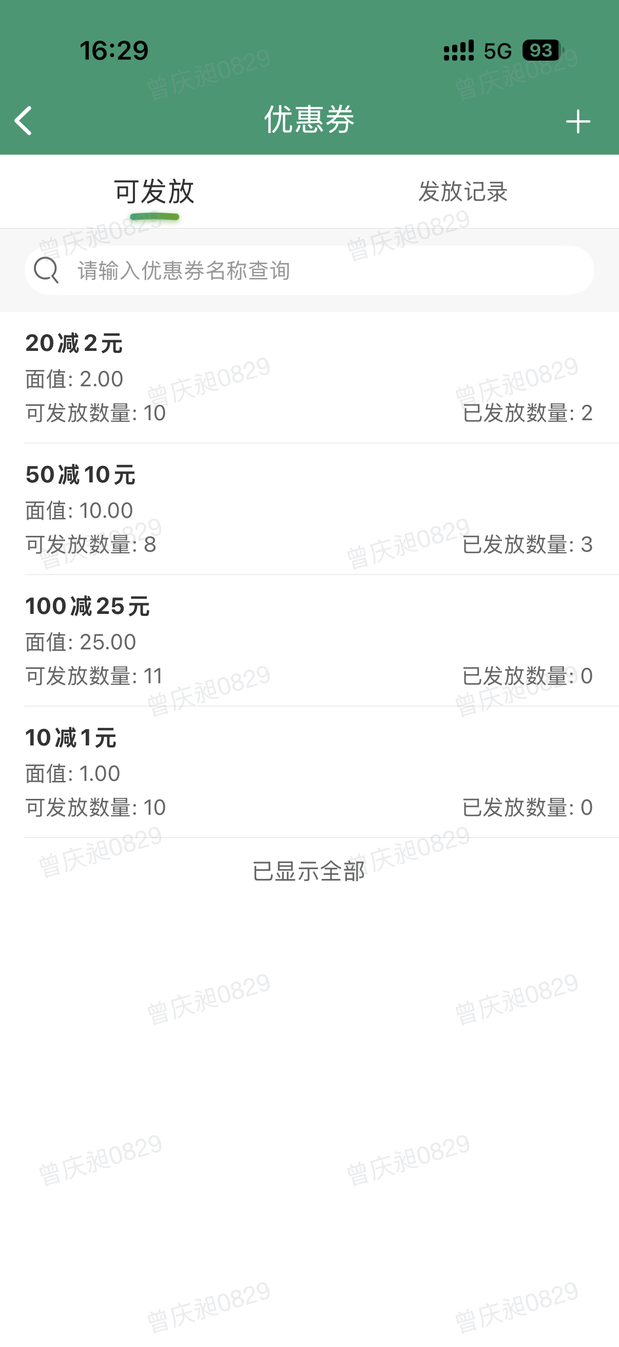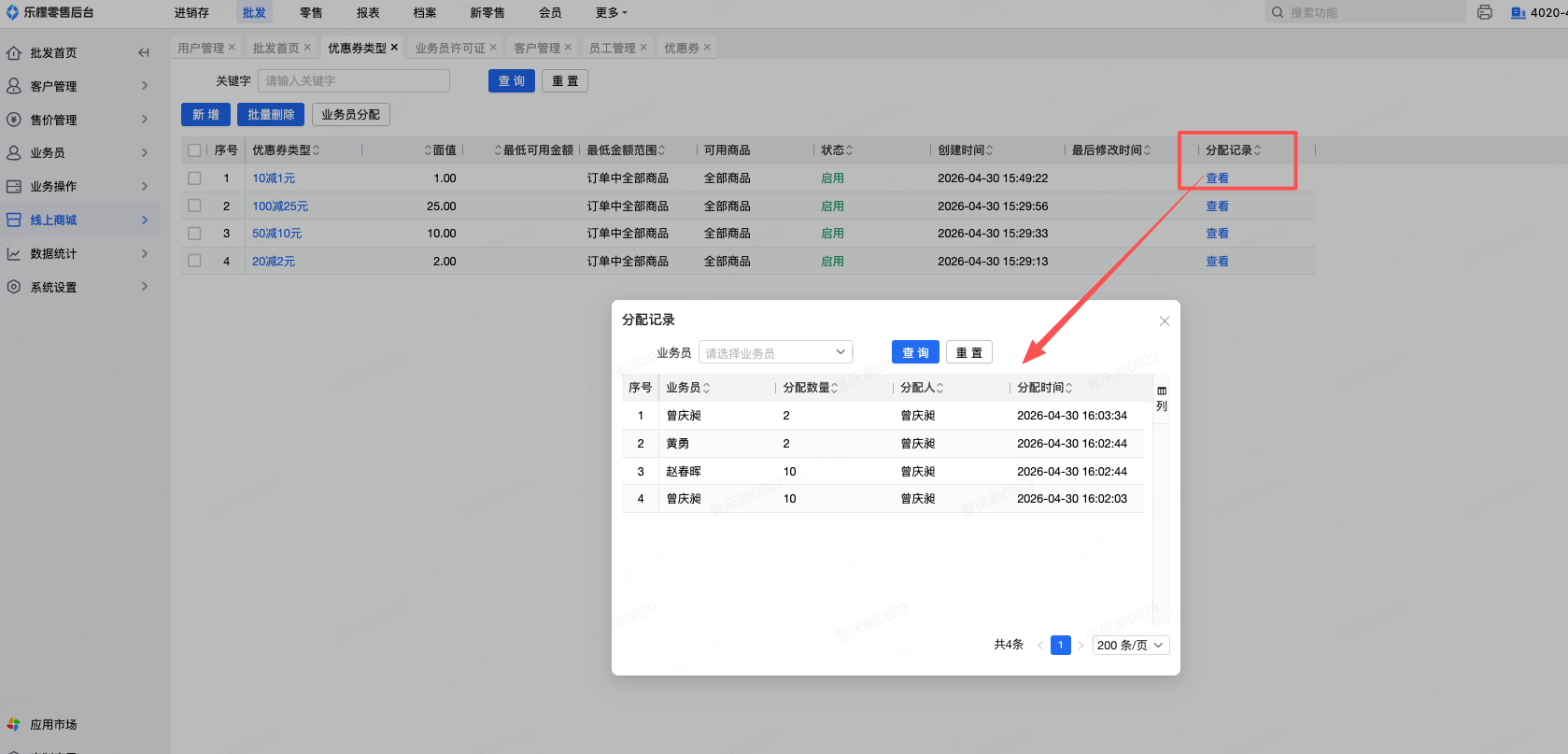 在优惠券类型列表有一列“分配记录”,点击“查看”可以查看各个优惠券类型的分配记录