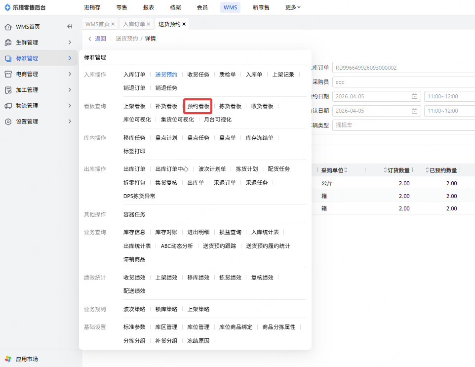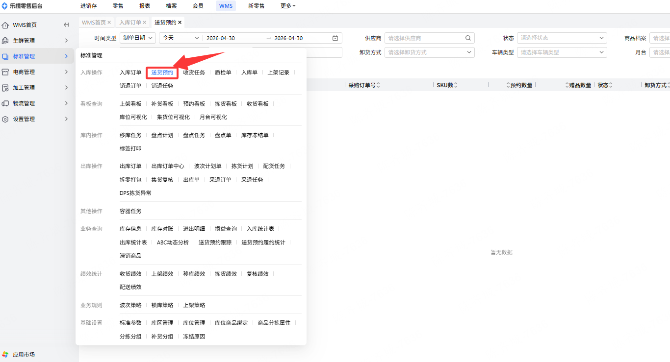 👉【操作路径】:1.标准管理-入库操作-送货预约
