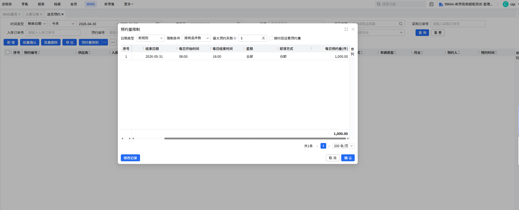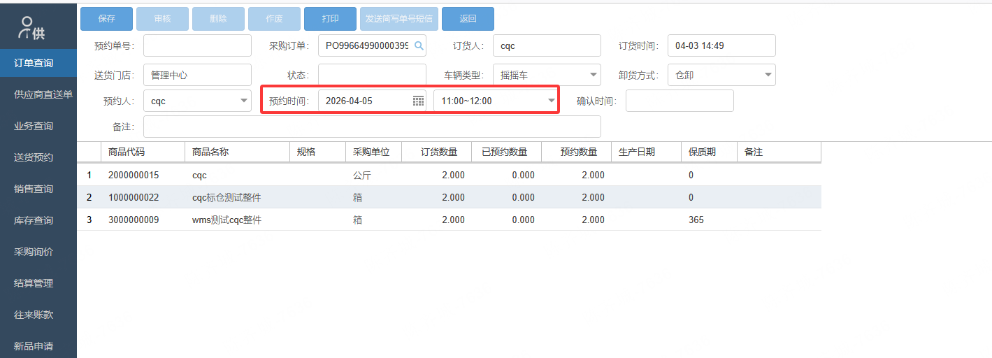 当商家在系统里做了采购订单之后,同时,在供应商平台上,供应商可以看到对应的订单。供应商平台订单查询页面上面有一个送货预约,点击进入送货预约界面,即可填写送货预约的时间,这个时间是由商家那边去限制的具体位置是在商家后台的送货预约预约量限制里面。