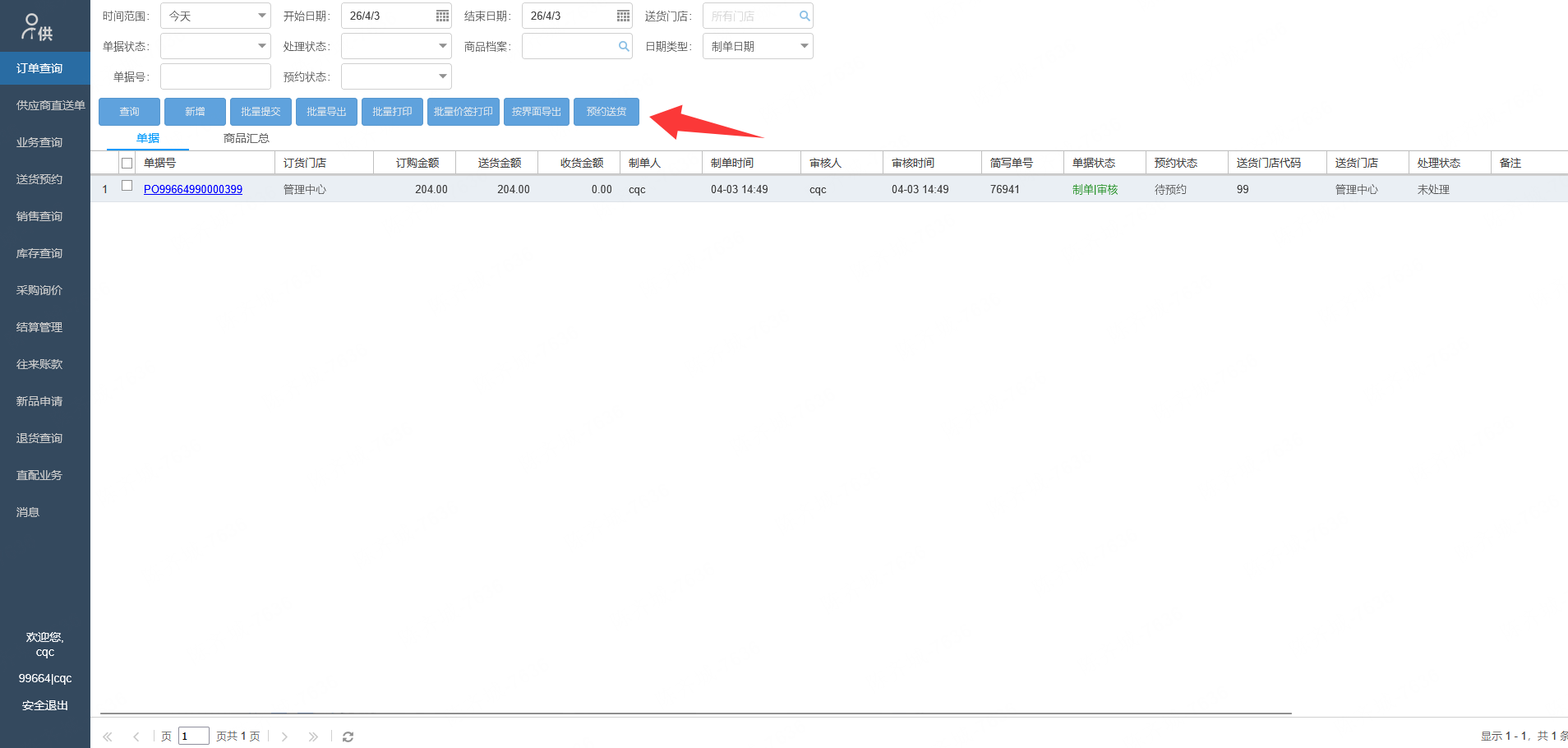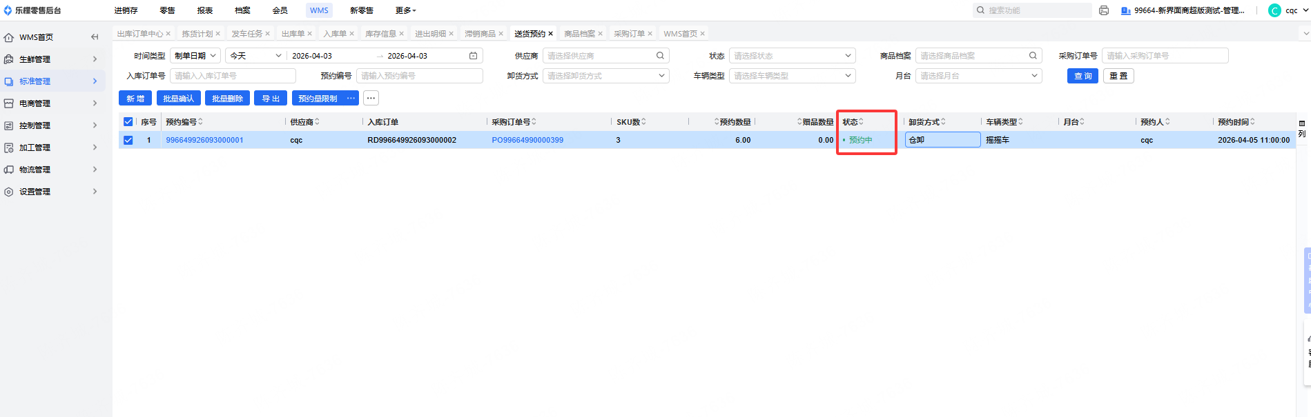 当供应商提交了送货预约的时间,商家在送货预约的界面,即可查询到对应供应商的一个预约单据。预约状态是显示预约中的,此时需要商家去处理这个预约单据。